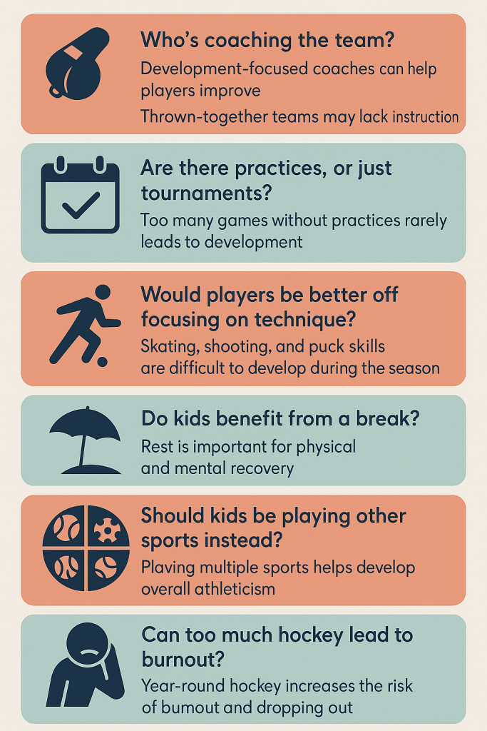 Young athletes benefit more from quality over quantity. Especially once a player gets to a certain level of skill, more ice time does not equal stronger play. A balanced off-season plan that includes rest, focused skill work, cross-training, and enjoyment is more effective than constant competition.