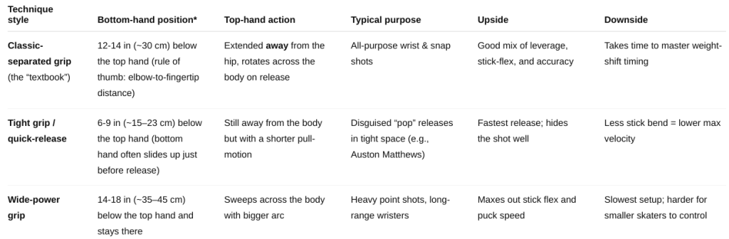 For most developing players, the “classic” grip—moderate hand separation with the top hand pushed out and active weight transfer—is the best foundational technique. It ingrains the leverage and body mechanics that every other modern NHL release builds on. Once that movement pattern is automatic, coaches can layer in quicker or more powerful variations without unlearning bad habits formed early. There’s no one-size-fits-all path to strong shooting technique, so be flexible in what you’re willing to teach your player and when. Just be sure not to get ahead of their development and spend lots of time on the basics. Faster is not better when it comes technical progressions.